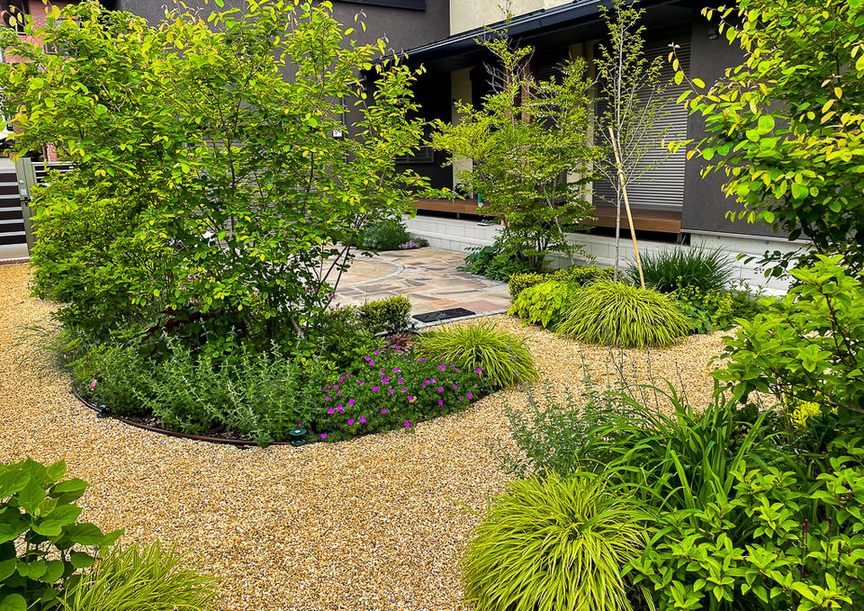 川の流れをイメージした緑豊かなガーデン。